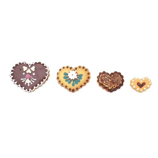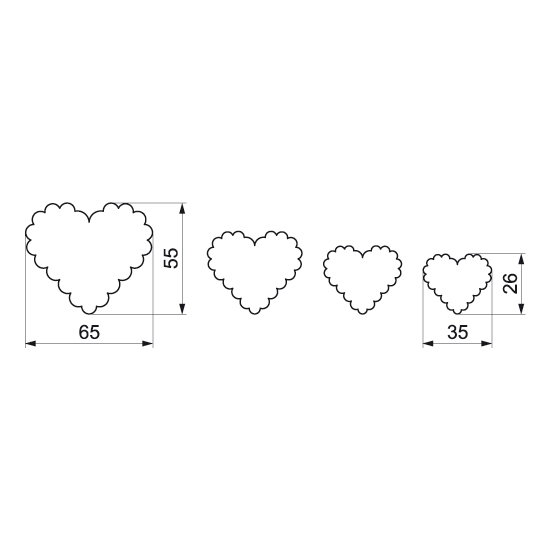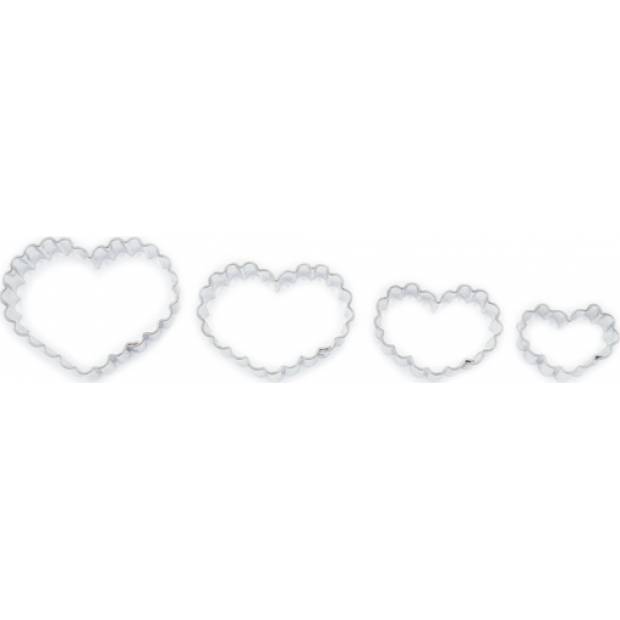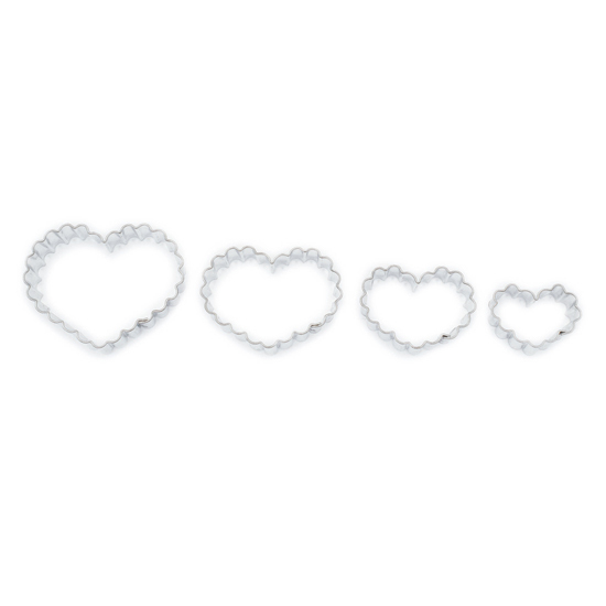 Vykrajovátka na cukroví s ostrou spodní hranou. V sadě jsou čtyři vykrajovátka různých velikostí (průměry od 3,5 do 6,5 cm) ve tvaru srdce s vroubkovaným okrajem. Vykrajovátka jsou vyrobena ze zdravotně nezávadného pocínovaného plechu.