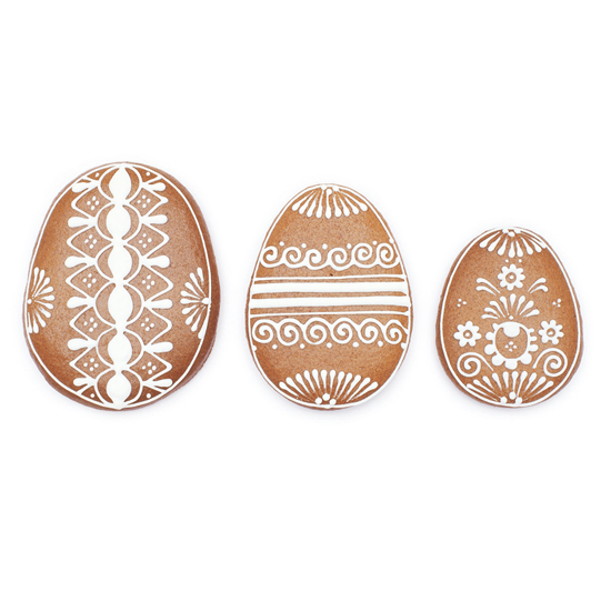 Vajíčka mají velikost 6 x 8,8 cm, 5 x 7 a 3,8 x 5,4 cm. Vykrajovátka jsou vyrobena z pocínovaného plechu, který je samozřejmě zdravotně zcela nezávadný a vzhledem k svému hladkému povrchu se po použití snadno umývá.