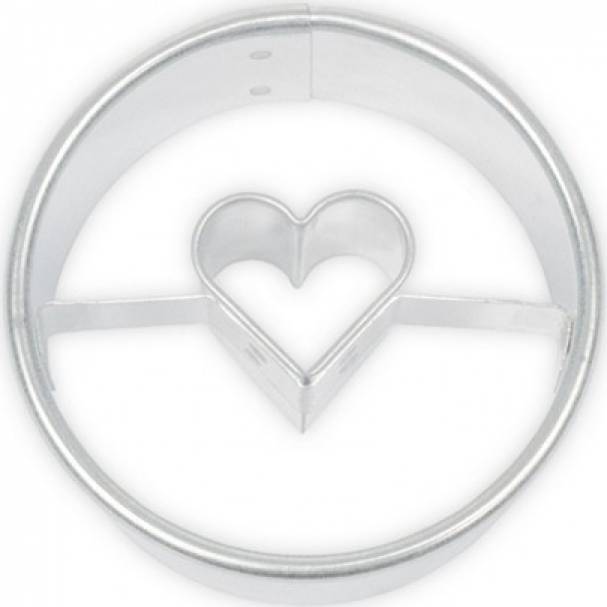 Vykrajovátko cukroví z různých druhů těsta v podobě kolečka se středem ve tvaru srdce. Na konečné ozdobení upečeného kolečka můžete použít různé cukrářské hmoty, krémy i jedlé zdobení, a také zdobící sady, které máme v nabídce samozřejmě také. Vykrajovátko je vyrobené ze zdravotně nezávadného pocínovaného plechu a velmi snadno se po použití umývá.