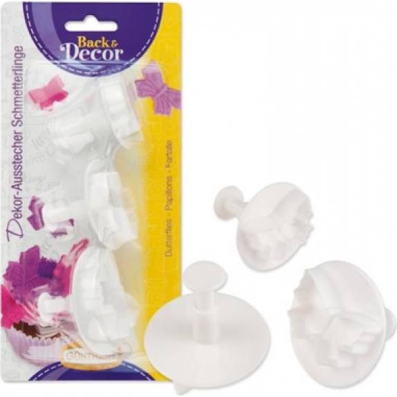 V této sadě najdete vykrajovátka z plastu ve tvaru motýla. Jsou omyvatelná ručně i v myčce nádobí. S pomocí těchto vykrajovátek lze tvarovat především fondant, ale i jiné cukrářské modelační hmoty. Rozměry 105 x 57 x 220 mm / Cutter: 30 x 20 mm/ 40 x 25 mm / 45 x 30 mm.