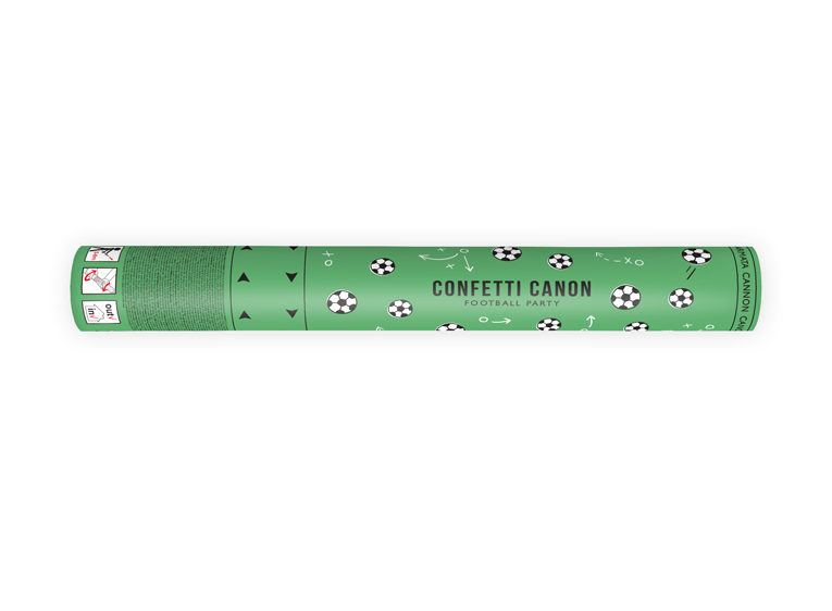 Konfetové dělo s balením papírových konfet ve tvaru fotbalových míčů.