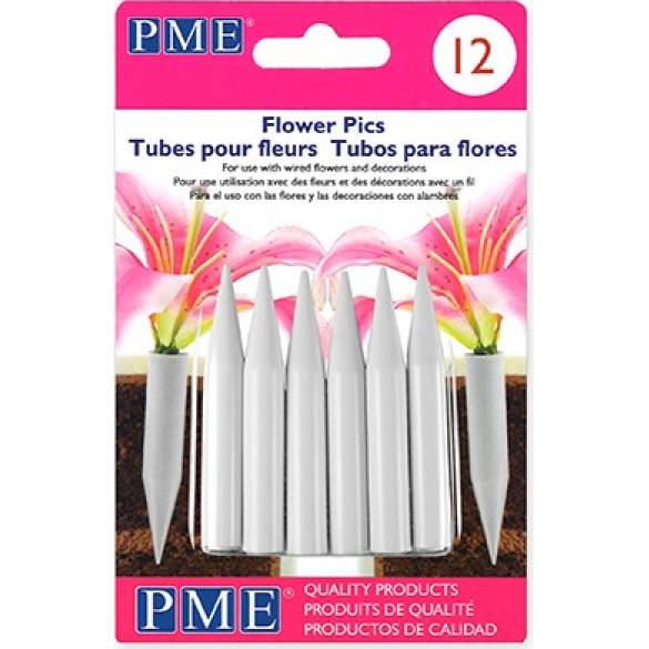 Vložte zápichy do dortu a naplňte je čerstvými květinami. Díky těmto plastovým zápichům z PME je také váš dort bezpečný pro použití drátů (při použití falešných nebo jedlých květin).