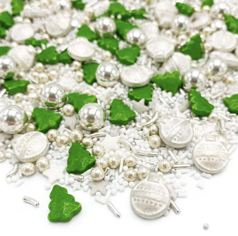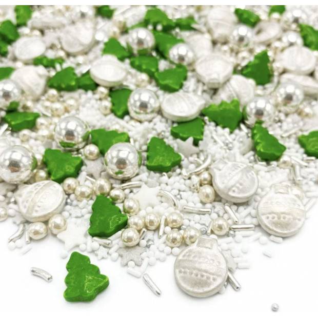 Se Sprinkles Christmas Eve 90g můžete proměnit jakékoli pečení v krásnou vánoční scénu. Posypová směs obsahuje různé figurky, jako jsou vánoční koule, prameny, hvězdy a vánoční stromky v barvách stříbrné, zelené a bílé. Díky krásné směsi různých figurek můžete s Sprinkles Christmas Eve dokonale ozdobit dorty, cupcaky, dorty, zákusky a další pochoutky. Tuto směs můžete použít i v kombinaci s našimi dalšími jedlými posypy. Například použijte nonpareils, cukrové perly nebo barevný cukr k vytvoření slavnostní scény.