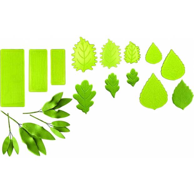 Sada obsahuje 9 kusů plastových formiček na výrobu listů z modelovacíh hmot a marcipánu. V této sadě jsou 3x kukuřičný list, 3x dubový list, 3x ibiškový list.