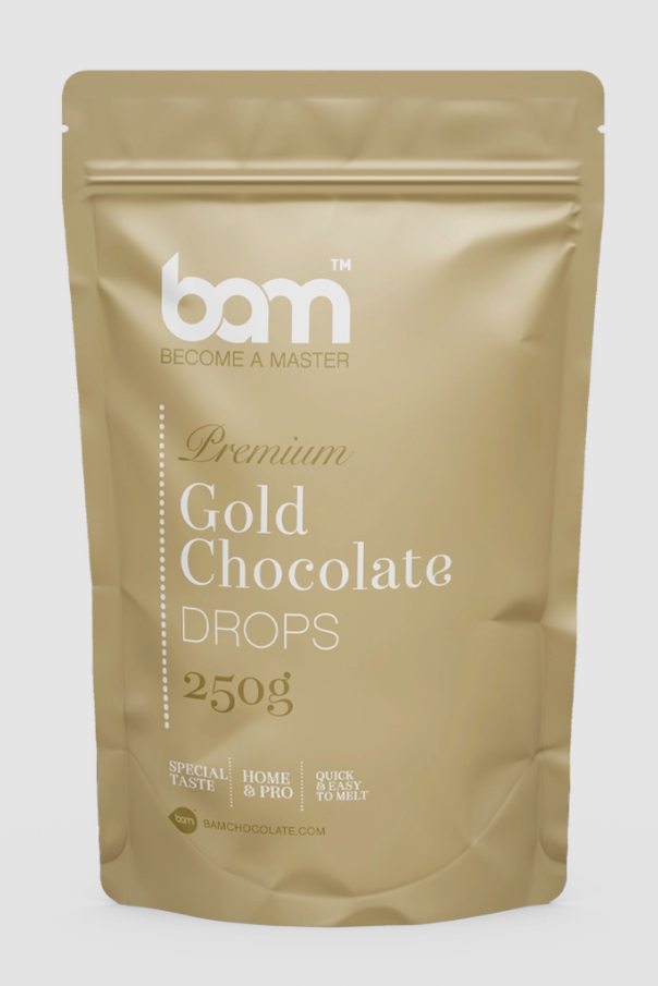 Čokoláda BAM GOLD je prestižní bílá čokoláda obohacená o karamel a karamelizované mléko. Její chuť je výrazně karamelová, s extrémně komplexními tóny karamelu, másla, smetany a jemným nádechem soli. Zlatý odstín této čokolády BAM vytvoří řadu úžasných dezertů. Tato čokoláda je tvarována do malých kapiček, což umožňuje rychlé a rovnoměrné rozpouštění. Lze z něj vyrábět různé krémy, pěny, polevy, ganache, zmrzliny, sušenky a různé náplně. Čokoláda BAM GOLD je bezlepková. BAM Gold Chocolate (250 g) vás okouzlí svou jemnou zlatavou barvou. Její chuť je výsledkem dvouletého vývoje a zajišťuje, že potěší i ty nejnáročnější milovníky čokolády. Může být použita pro různé účely, jako jsou pudinky, polevy, krémy, modelování a zdobení. BAM Chocolate je stvořena pro všechny milovníky tvoření dezertů, domácí kuchaře i zkušené cukráře, kteří chtějí svým dezertům dodat dokonalou tečku za prvotřídní čokoládou.